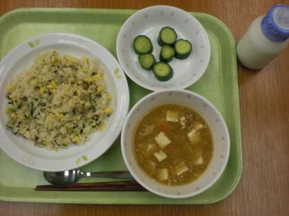 「青菜のチャーハン、きゅうりの甘酢かけ、麻婆汁、牛乳」です。
