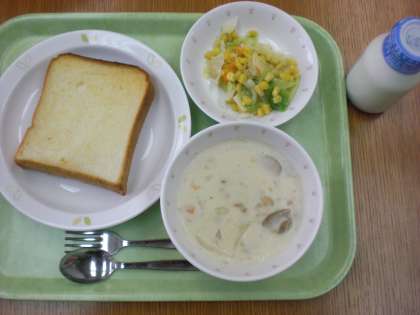 「バタートースト、クリームシチュー、コーンサラダ、牛乳」です。