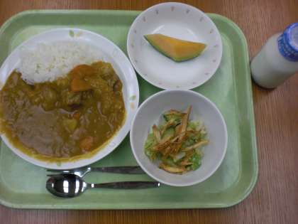 カレーライスは、給食の中でも人気の高い献立です。インド料理を元にイギリスで生まれ、日本で発展した料理です。インドのカレーよりとろみが強くなっているのは、イギリス海軍のメニューに採用されたとき、船の揺れに対応するためだったという説があります。サラダのごぼうは熊本県産のおいしい新ごぼうをささがきにして素揚げしました。きょうの果物は、甘夏みかんの予定でしたが、入荷が難しく、メロンに変更となりました。