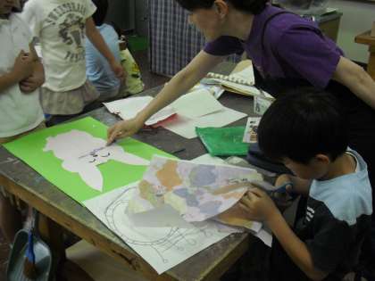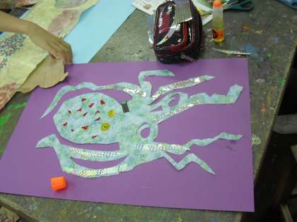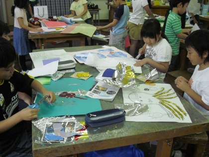 4年生の図工では家からもちよったいろいろな紙(包装紙や広告の紙等々)を使って「動物」を制作中です。紙の模様や色などを生かして、おもいおもいの動物をハサミを使って作り上げています。犬やウサギ、ネコなどに混じって蛸等も生まれています。できあがった動物はこれから楽器を手に「動物の音楽隊」に編成されます。楽しんで作っている様子が伝わるでしょうか。
