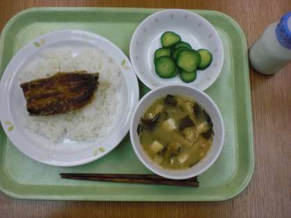「魚のかば焼丼、冬瓜のみそ汁、きゅりのひとしお、牛乳」です。