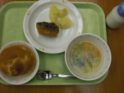 きょうの魚はさばです。青魚と呼ばれる背中の青い魚(さば、さんま、いわし、あじなど)には、脂質が多く含まれています。魚の脂質には不飽和脂肪酸が多く含まれています。魚の脂質は血液をサラサラにし、コレステロールや中性脂肪を減少させる効果があるため、動脈硬化や脳卒中などの生活習慣病予防に役立ちます。また脳の発達や機能を高める効果もあるといわれています。きょうは、さばにカレー粉の衣をつけて揚げました。