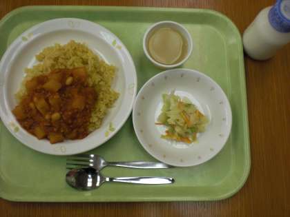 「チリビーンズライス、キャベツサラダ、りんごゼリー、牛乳」です。