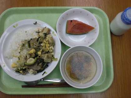 きょうは沖縄の「ゴーヤチャンプル」です。「チャンプル」とは炒めることです。ゴーヤの苦みは児童には向かないかなと心配しましたが、けっこう食べてくれました。スープのもずくも沖縄県産のものを使いました。