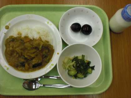 きょうはたてわり給食の日でした。それぞれの班にわかれて、5・6年生が当番になって配膳してくれました。みんなでたのしい給食の時間が過ごせました。きょうのカレーには夏が旬のなす、さやいんげんなどの野菜がたくさん入っていて美味しくできあがりました。デザートのぶどうは巨峰で、これも夏から秋が旬です。旬の食べ物はみずみずしく、おいしく、栄養価も高いので、家でもぜひ食べてほしいと思います。