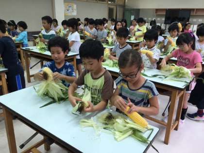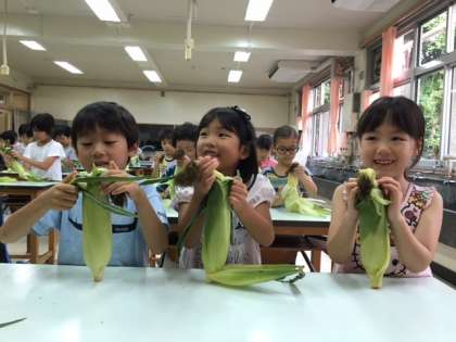 7月15日金曜日、今朝は2年生の食育の一環として、トウモロコシの皮剥き体験がありました。いつも出来上がりのトウモロコシは食べても、実際に剥くことはあまり経験がないようでした。ひげの本数が種の数 実際に食べる一粒一粒 と聞いてビックリしていました。