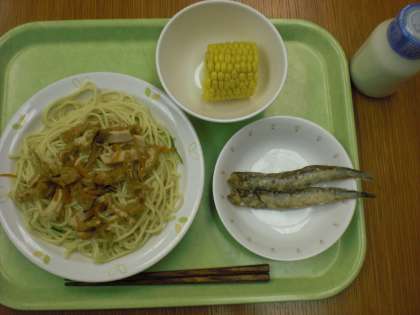 「冷し中華、ししゃものからあげ、蒸しとうもろこし、牛乳」です。
