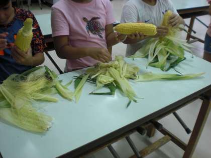 きょうのとうもろこしは、2年生が1時間目の授業で、皮むき体験をしました。ひとり1〜2本ずつ、丁寧にむいてくれました。皮をむいたとうもろこしは給食室に届けられ、おいしく蒸し上げました。とうもろこしの栄養は、おもに体の調子を整えてくれます。ビタミンB群を含み、成長に必要な葉酸や、食物繊維が多いです。おやつにもぴったりです。