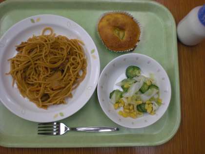 「スパゲッティナポリタン、コーン入りフレンチサラダ、野菜ケーキ、牛乳」です。