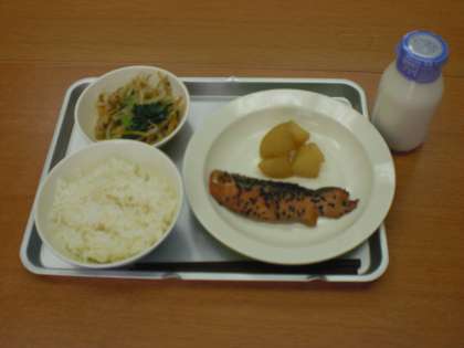 今日の給食は、ごはん・鮭の南部焼き・ジャガイモの甘辛煮・おひたし・牛乳です。