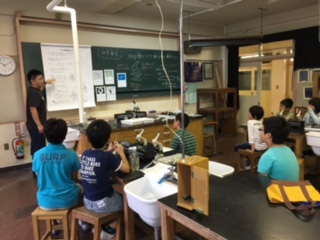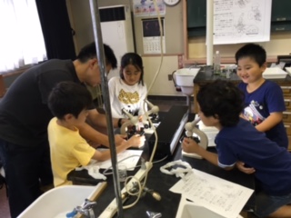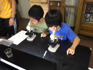 顕微鏡を一人一台使って、微生物を観察しました。初めに顕微鏡の使い方をしっかりと教えて貰いました。次に、ミジンコ、ゾウリムシ、アオミドロ等々の微生物を観察しました。中には、多摩川の水や家の花瓶の水を持ってきた子供もいました。はっきりと観えた時の感動の声があちこちから上がって楽しそうでした。