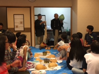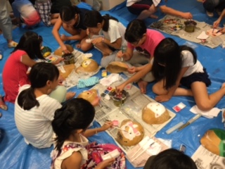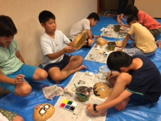 夕食後は、日光伝統工芸のふくべ細工の体験に挑戦しました。夕顔からかんぴょうを取った後の実に絵付けしました。思い思いの絵を描き上げました。この後、ニスを塗って学校に届けられます。
