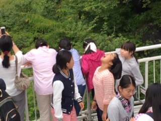 今日最後の見学先である華厳の滝までバスに乗ってきました。日本三大名瀑の一つである華厳の滝の雄大さ、力強さに大感激していました。マイナスイオンを体一杯吸い込もうとしている姿が可愛らしかったです。