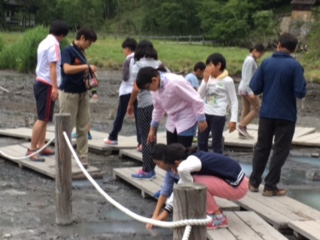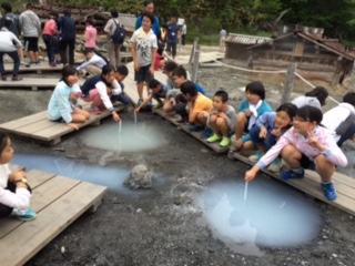 宿に戻ってから、近くの湯本温泉の源泉まで歩いて行きました。担任が班に一つずつネットに入れた10円玉を渡しました。源泉に漬けて色の変化を楽しみました。
