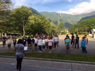最終日の朝も快晴です。昨夜は、みんな早々にぐっすり寝ました。そのせいか、今朝の顔はスッキリとして、ラジオ体操の動きもよかったです。