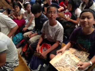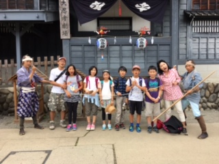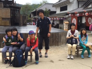 江戸村では、岡っ引きに捕まえられてお縄を頂戴したり、忍者劇場を観たりしました。興奮した後は、一息ついて休憩してまた巡ります。