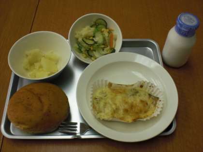 今日の給食は、セサミパン、魚(生鮭)のマヨネーズ焼き、粉ふきいも、アスパラガスのサラダ、牛乳です。