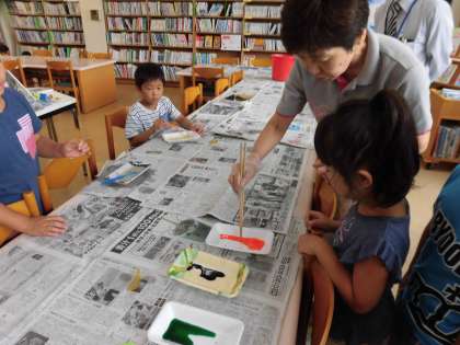 サマースクール第2日目、3つ目の講座は、夏のお話と工作の会でした。図書室で、お話を楽しんでから葉っぱのしおり作りをしました。楽しみながら葉っぱのしおりを作ることができました。きれいな葉っぱの形に、できたしおりを大切に手にとっていました。