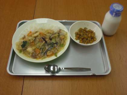 今日の給食は、中華丼・大豆とじゃこの甘辛あげ・牛乳です。
