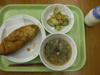「あげパン、春雨スープ、野菜の中華風味、牛乳」です。