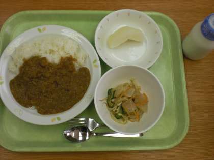 「キーマカレーライス、こんにゃくサラダ、なし、牛乳」です。