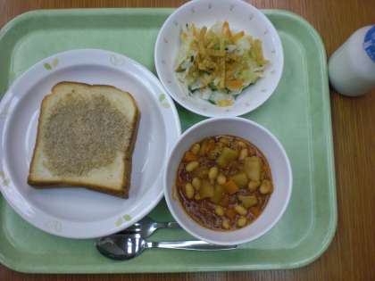 「セサミトースト、ポークビーンズ、パリパリサラダ、牛乳」です。