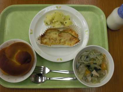 「ミルクパン、魚のチーズ焼き、パセリポテト、野菜のスープ、牛乳」です。