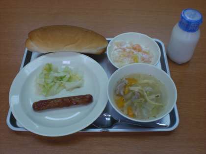 今日の給食は、セルフウィンナーサンド・ヌードルスープ・フルーツヨーグルト・牛乳です。