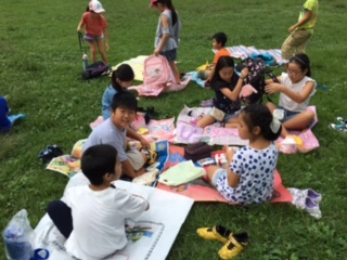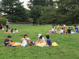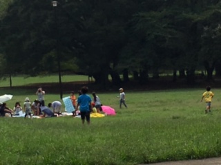 午前の見学を順調に終え、砧公園に来ました。楽しみにしていたお弁当を食べました。食べ始めは、程よく曇っていたのですが、少し経つと真夏日の様になりました。雨傘を日傘代わりにし始める子供もいました。
