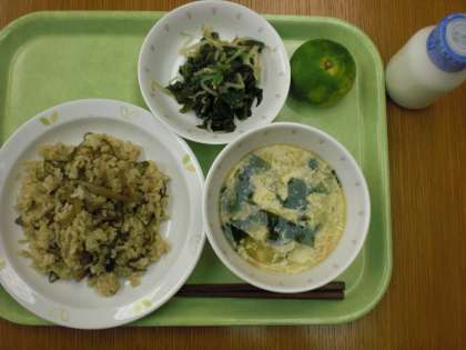 「豚肉とごぼうのごはん、かきたま汁、和風サラダ、みかん、牛乳」です。