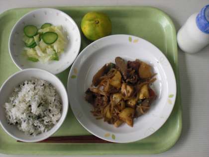 「わかめとじゃこのごはん、きんぴら煮、ひとしお野菜、みかん、牛乳」です。