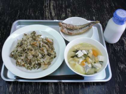 今日の給食は、豚肉とごぼうのごはん・みそ汁・ししゃものから揚げ・牛乳です。