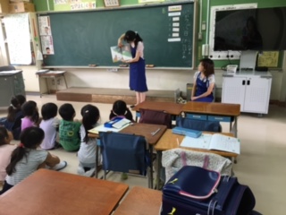 お揃いのネイビーブルーのエプロンをつけてお話して下さる姿も、学校の中では誰もが大切な存在と認識しています。ご都合のつく水曜日の朝に活躍していただける読み聞かせボランティアには、常時入会できます。どうぞ奮ってご入会下さい。