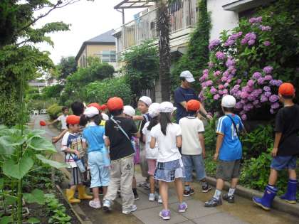 生活科の学しゅうで烏山川緑道へ町たんけんへ行って来ました。雨上がりの緑道は緑がきれいで、アジサイの花がきれいにさいていました。