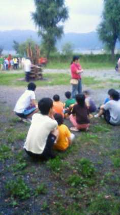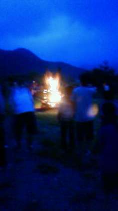 食事をすませて、キャンプファイアです。みんなエビカニクスを楽しみにしています。だんだん暗くなってきました。これが終わると今日はお休みです。