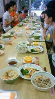 宿舎最後の夕食には甲州名物のほうとうもでました。食事が済むと7時からはブロック4校での子ども会です。大いに楽しみました。