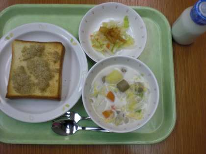 「セサミトースト、ミルクポトフ、パリパリサラダ、牛乳」です。