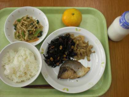 「ごはん、魚の照り焼き、野菜のごまだれかけ、ひじきの煮つけ、れんこんのきんぴら、みかん、牛乳です。
