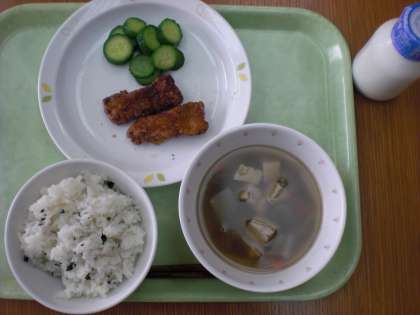 「ごはん、いかのかりんとあげ けんちん汁、きゅうりのひとしお、牛乳」です。