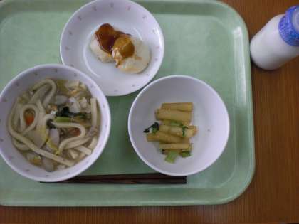 「みそ煮込みうどん、大根の中華味、いももち、牛乳」です。