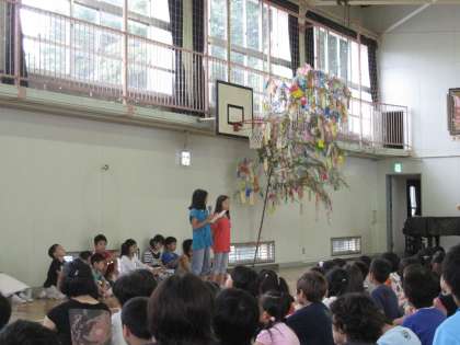 6日(日)に、七夕集会がありました。七夕の話や七夕クイズなどを楽しみ、各クラスの願い事を発表しました。体育館には、みんなの願い事を書いた短冊をつるした、大きな笹を飾りました。