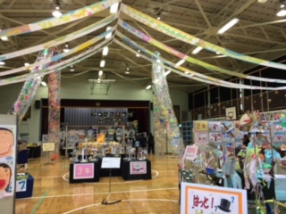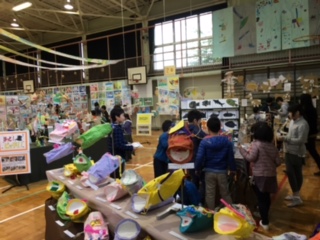 今年のテーマは「ここにいる かけがえのない ぼくわたし」でした。進級してから5カ月間に制作した絵や工作、家庭科作品と学年交流での共同作品が体育館一杯に所狭しと並べられました。