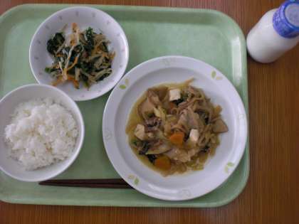 「ごはん、すきやき煮、野菜のごまあえ、牛乳」です。