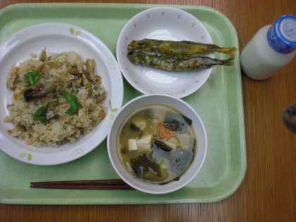 「きのこごはん、ししゃもの二色揚げ、みそ汁、牛乳」です。