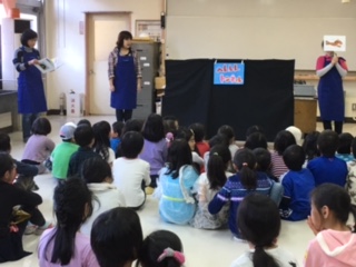 大人用の話を聞く時には、子供達は家庭科室で、読み聞かせの会の皆さんによるお話会に参加しました。