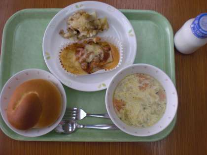 「ミルクパン、魚のピザ風、ジャーマンポテト、卵スープ、牛乳」です。
