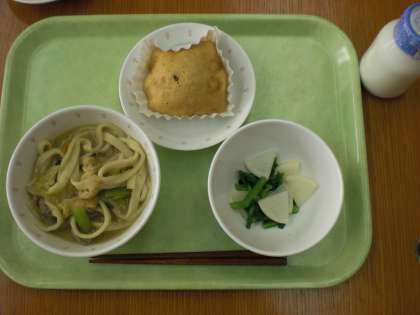 「ほうとう、かぶのゆずかけ、きなこ蒸しパン、牛乳」です。