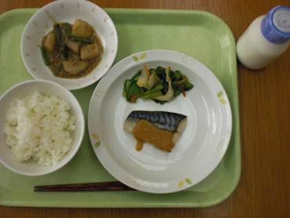 「ごはん、魚のピリ辛ソースかけ、野菜のおかかかけ、里芋の甘辛煮、牛乳」です。