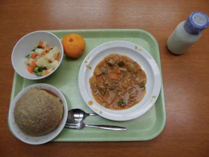 「ビスキュイパン、鶏肉のトマトソース煮、マセドアンサラダ、みかん、牛乳」です。