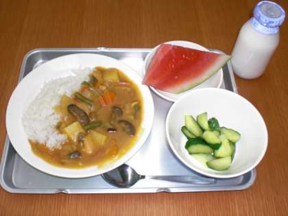 今日の給食は、夏野菜のカレーライス・きゅうりのひとしお・くだもの(すいか)・牛乳です。